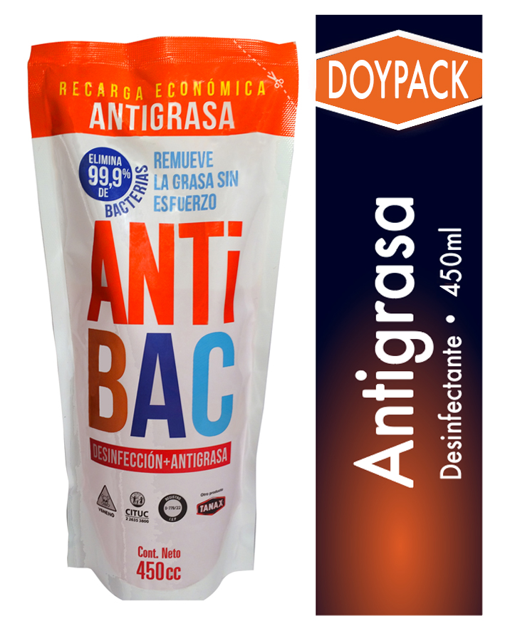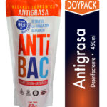 Antigrasa desinfectante ANTIBAC en doypack, 450 ml. Remueve grasa y residuos en cocinas, comercios y superficies de uso frecuente.
