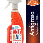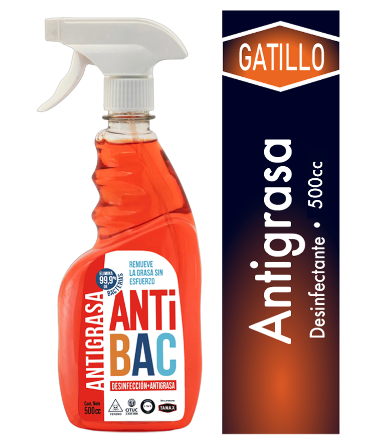 Antigrasa desinfectante ANTIBAC con gatillo, 500 ml. Remueve grasa y residuos en cocinas, comercios y superficies de uso frecuente.