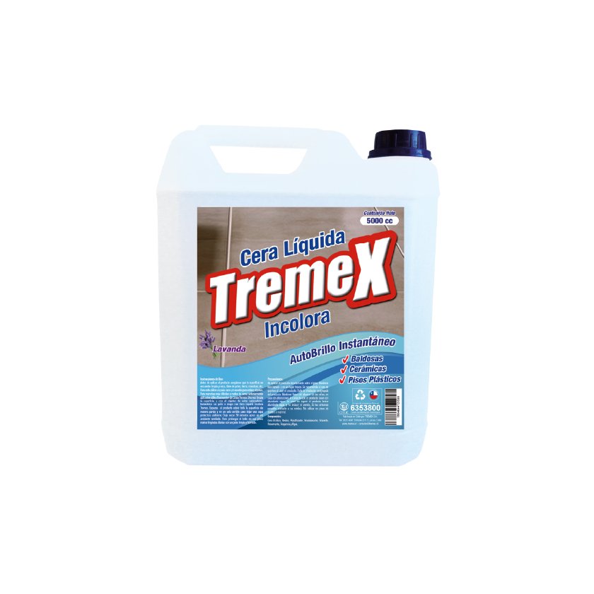 Cera líquida TREMEX incolora, 5 L. Protege y da brillo a pisos en tareas de mantención doméstica, comercial e institucional.