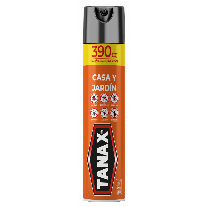 Insecticida TANAX en aerosol para casa y jardín. Presentación de 390 ml para control de plagas en áreas interiores y exteriores.