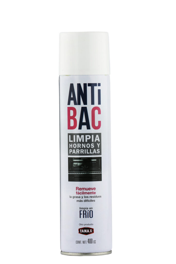 Limpiador para hornos y parrillas ANTIBAC en aerosol, 400 ml. Remueve grasa adherida en superficies de cocina.
