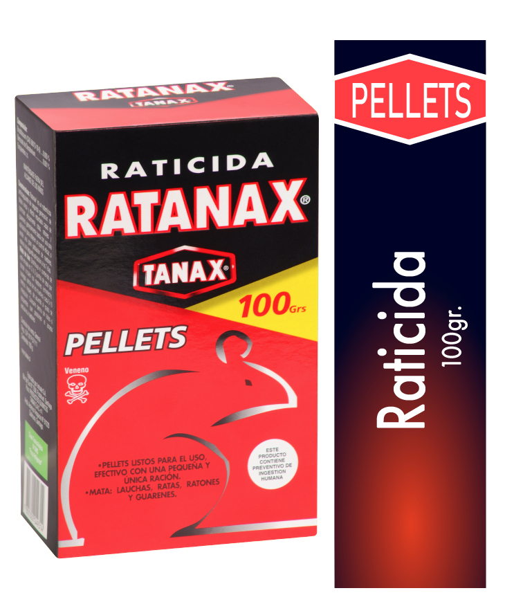 Raticida RATANAX en pellets, 100 g. Apoya el control de roedores en entornos domésticos, comerciales e institucionales.