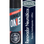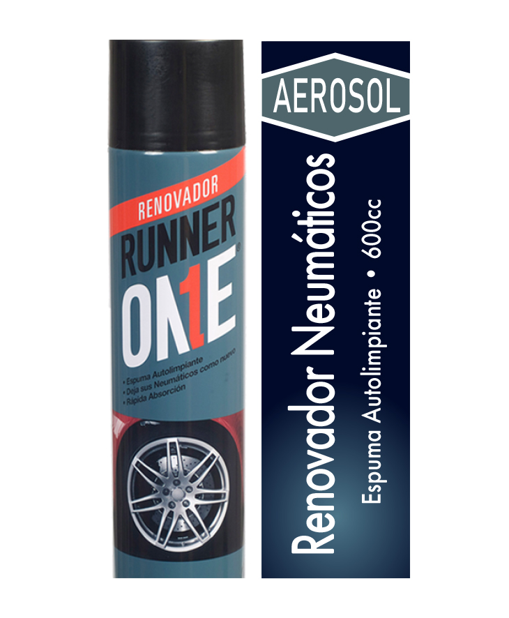 Renovador de neumáticos RUNER ONE en aerosol, diseñado para ayudar a mejorar la terminación visual y el aspecto exterior de las ruedas. Su presentación de 600 ml facilita una aplicación rápida en labores de mantención automotriz.