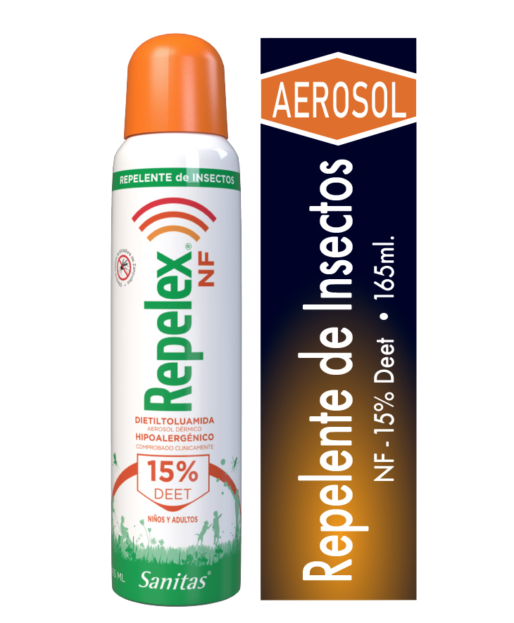 Repelente de insectos REPELEX NF 15% en aerosol, 165 ml. Protege la piel en actividades al aire libre, viajes y uso cotidiano.